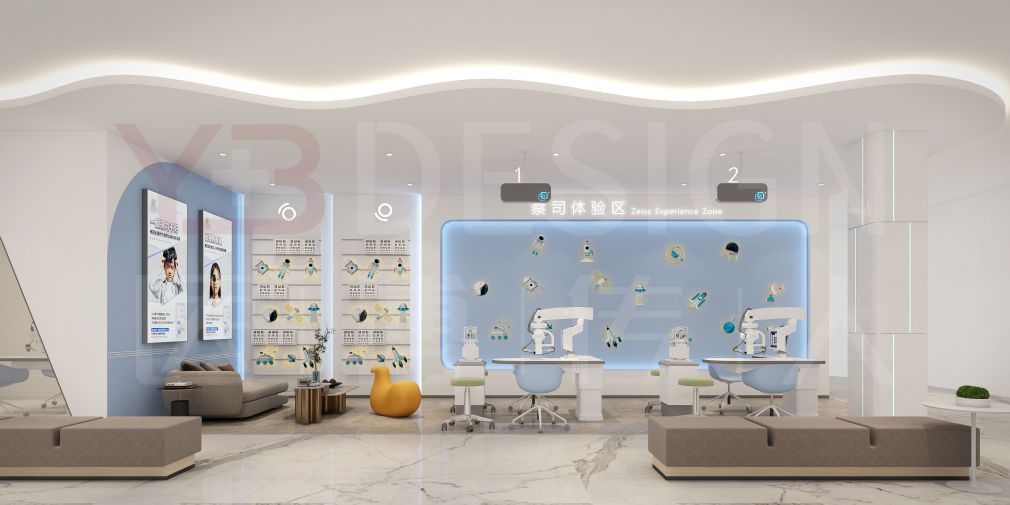 蔡司体验区:此区域使用了现代简约风格,以蓝色和白色为主色调,营造出清新科技感。大量运用了圆润的设计元素,软化了医疗空间的硬朗感。配备了高端蔡司检测设备,确保检查的准确性和舒适性。信息区采用互动式屏幕,增强患者的体验感。