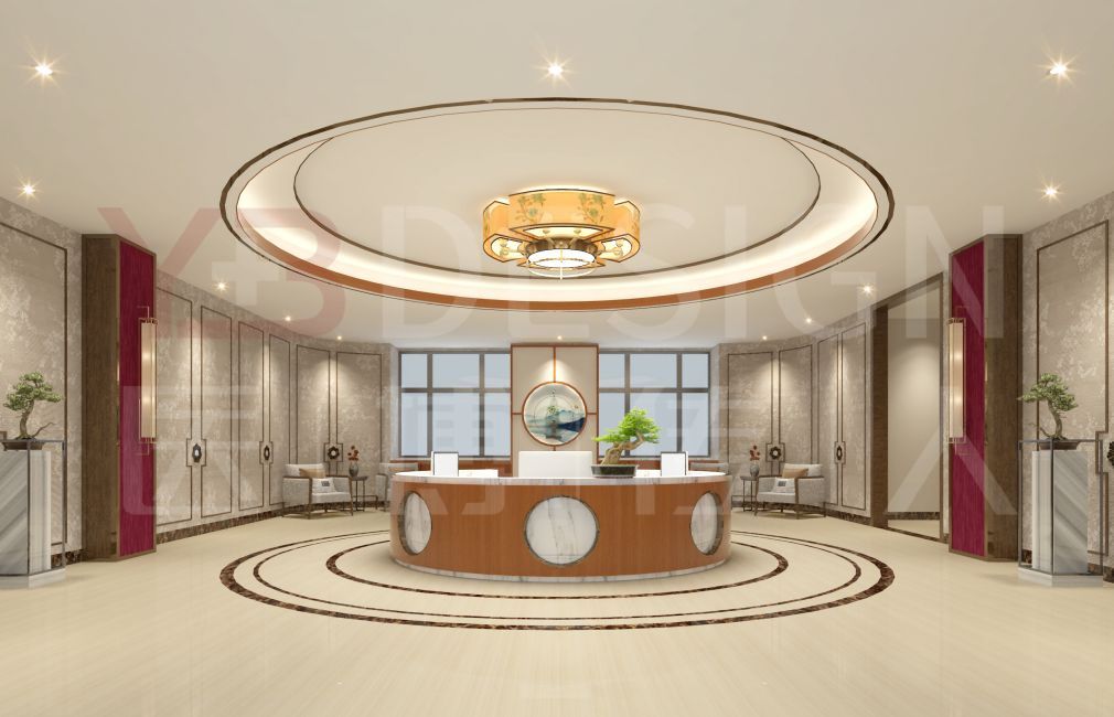 导诊台:导诊台采用圆润的设计与温暖的色调,为来访者提供亲切和专业的第一印象。环形吊灯与台面的材质呼应,展示了一种和谐的美学。整个接待区域充满了现代感与舒适感,确保每位顾客的体验都能从踏入这里的那一刻开始变得与众不同。