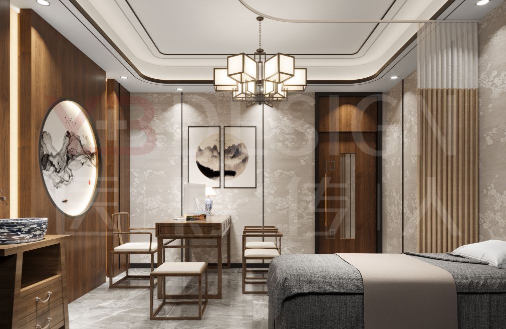 针灸室: 传统与现代设计元素完美融合,创造出一个宁静的治疗环境。墙面上的圆形装饰画与和谐的自然图景相映成趣,营造出一种平和的氛围,让人即刻感到心灵的平静与宁谧。悬挂的灯具以其典雅的设计,不仅提供柔和的照明,也为整个空间增添了一抹艺术气息。细腻的布艺与柔软的按摩床保证了治疗的舒适性,使得体验不仅是身体上的疗愈,更是一次心灵上的洗涤。