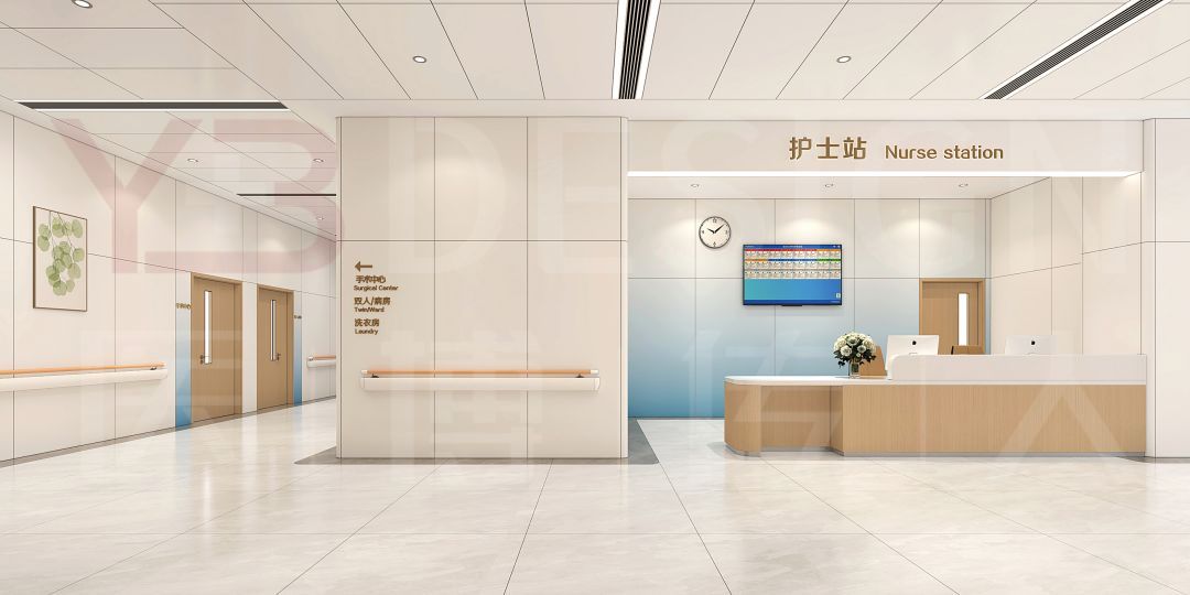 護士站: 以清晰的視線和便捷的布局服務于護理工作的高效進行。中性的色調與柔和的照明營造了一個溫馨和專業的工作環境。墻面上的時鐘和叫號系統明顯可見,確保了信息的即時傳達和交流。